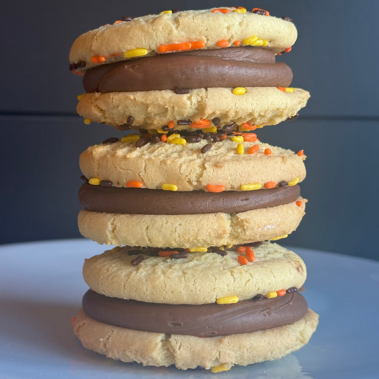 Two of our mini famous sugar cookies stuffed with chocolate buttercream and rolled in Autumn sprinkles.